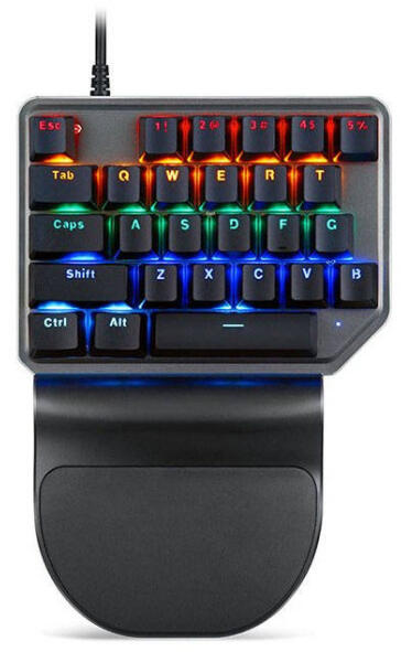 Motospeed K27 billentyűzet játékosoknak A Motospeed K27 egy modern billentyűzet a legfontosabb billentyűkkel az FPS játékok szerelmeseinek. Egyszerűen és kényelmesen használható egy kézzel. A dedikált csuklótámasszal ellátott okos kialakítás csökkenti a fáradtságot és növeli a kényelmet. A Motospeed K27 teljesen új minőségű játékélményt nyújt. 27 mechanikus billentyűvel felszerelt Motospeed K27 játékbillentyűzet, így nagyszerű eredményeket érhetsz el játék közben, és új rekordokat dönthetsz. Ugyanakkor a készülék különleges kialakítása páratlan használati kényelmet biztosít. Játékos háttérvilágítás A billentyűzet minden egyes billentyűje RGB LED-es háttérvilágítással rendelkezik, így a K27 bármilyen játékasztalon remekül mutat majd. Ráadásul akár 5 világítási mód közül is választhatsz. Így szabadon testre szabhatod az eszköz megjelenését a saját preferenciáid szerint. A milliónyi szín és a meglepő fényhatások egyedi karaktert kölcsönöznek a billentyűzetnek. Tartósság és teljesítmény A gombok élettartama körülbelül 50 millió kattintás, ami azt jelenti, hogy rendkívül tartósak. A készülék fokozott teljesítményéért viszont egy fejlett flash chip felelős. Mindez azt jelenti, hogy a billentyűzet hosszú évekig jó szolgálatot tesz. GyártóMotospeedModellK27TípusMech anikusSzínFeketeCsatlakozásVezetékesB illentyűk száma27KompatibilitásWindows XP/7/8/10Kulcs élettartama50 millió billentyűleütésMegvilágításRGBAnya gABS, alumínium ötvözetInterfészUSBMéretek211x148x41 mmSúly378gMűködési áram300mAMűködési feszültségDC 5VKapcsolókOUTEMU KékEgyéb5 háttérvilágítási mód, testreszabható háttérvilágítási módok